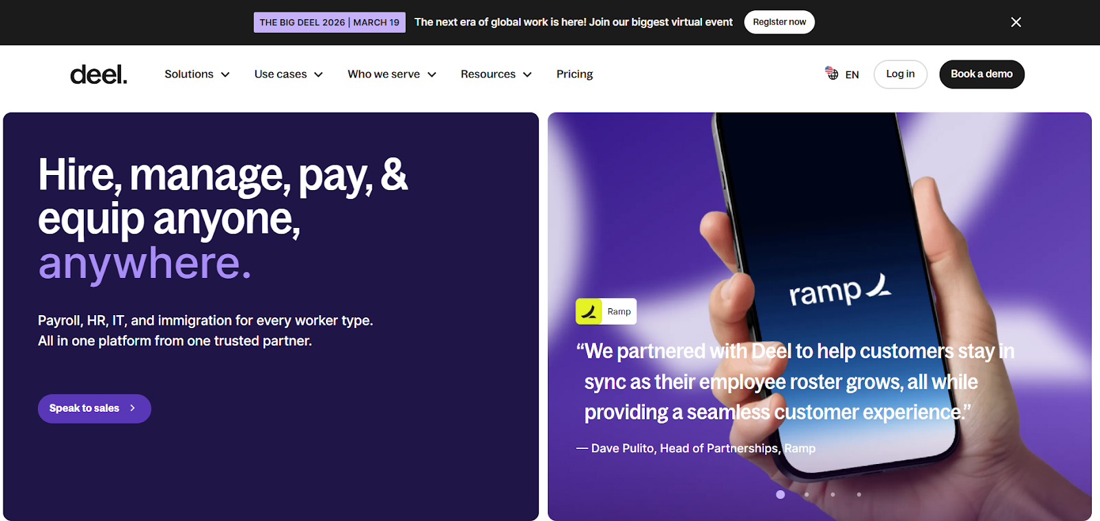 Deel is a global Employer of Record and contractor management platform operating in Bulgaria, best suited for companies that need rapid employee setup and automated payroll and tax processing.