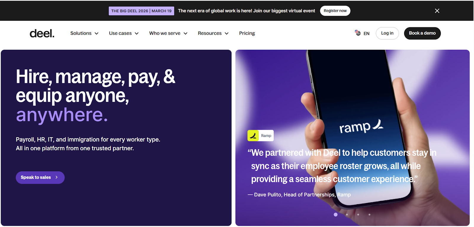 Deel is a global EOR platform suited for Colombia hiring programs that require rapid onboarding, with per-employee-per-month pricing that scales with headcount across international employment markets.
