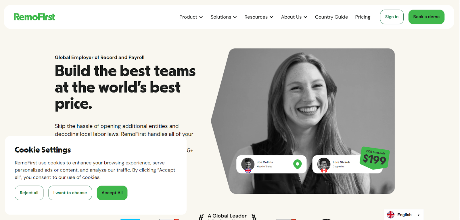 Remofirst charges $199 per employee per month, making it one of the lowest base-priced EOR options reviewed in this Colombia comparison.