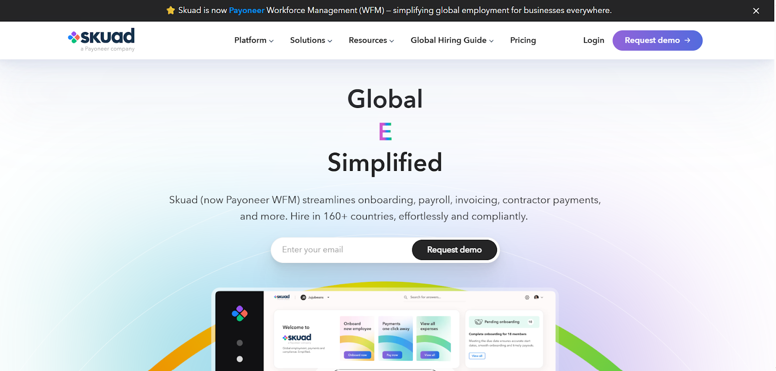Skuad is a global EOR with Colombia coverage, suited for companies seeking international employment infrastructure for LATAM and other markets through a centralized platform.