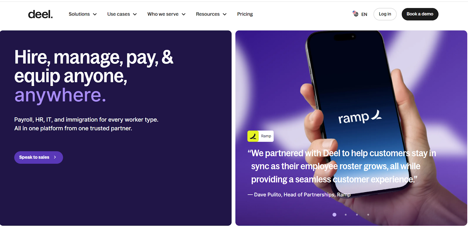 Deel is a global EOR platform with coverage across 150+ countries, including Ivory Coast, suited for companies needing a unified platform for both employees and contractors with 24/7 support.