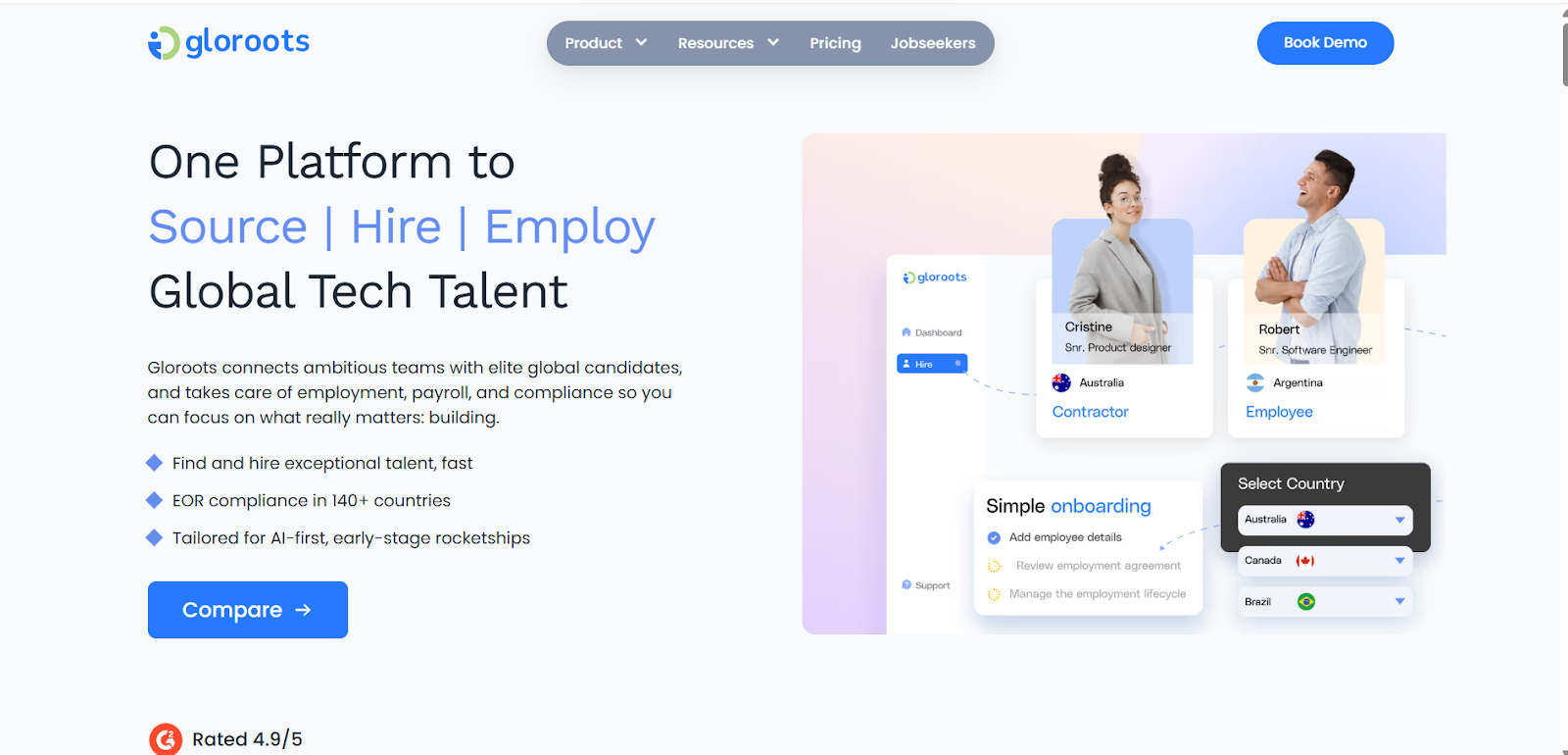 Gloroots is a global hiring and employment platform covering 140+ countries, suited for startups, scaleups, and SMBs that need cost-effective EOR options with straightforward pricing and strong support for Myanmar market entry.