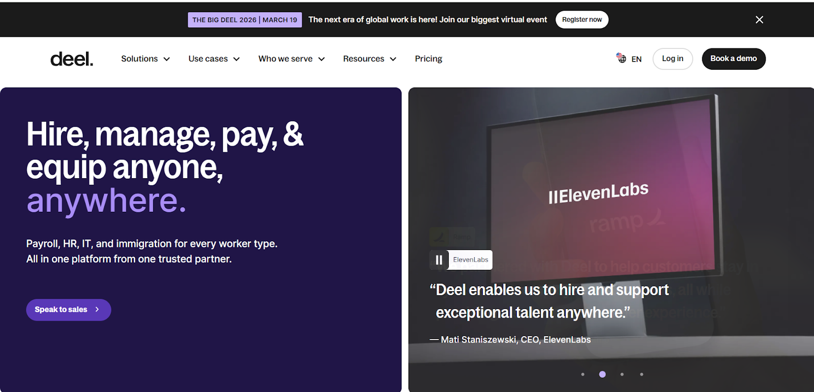 Deel is a platform-focused EOR covering 160+ countries, suited for tech companies and distributed teams that need contractor management, HRIS integrations, and full-time employment support across Myanmar and global markets.