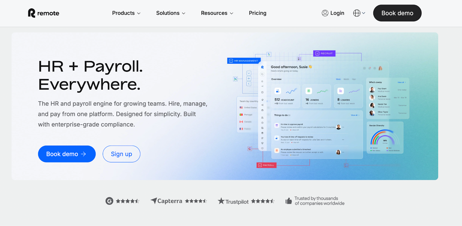 Supports hiring and workforce management in more than 180 countries, enabling companies to expand internationally without creating local entities.