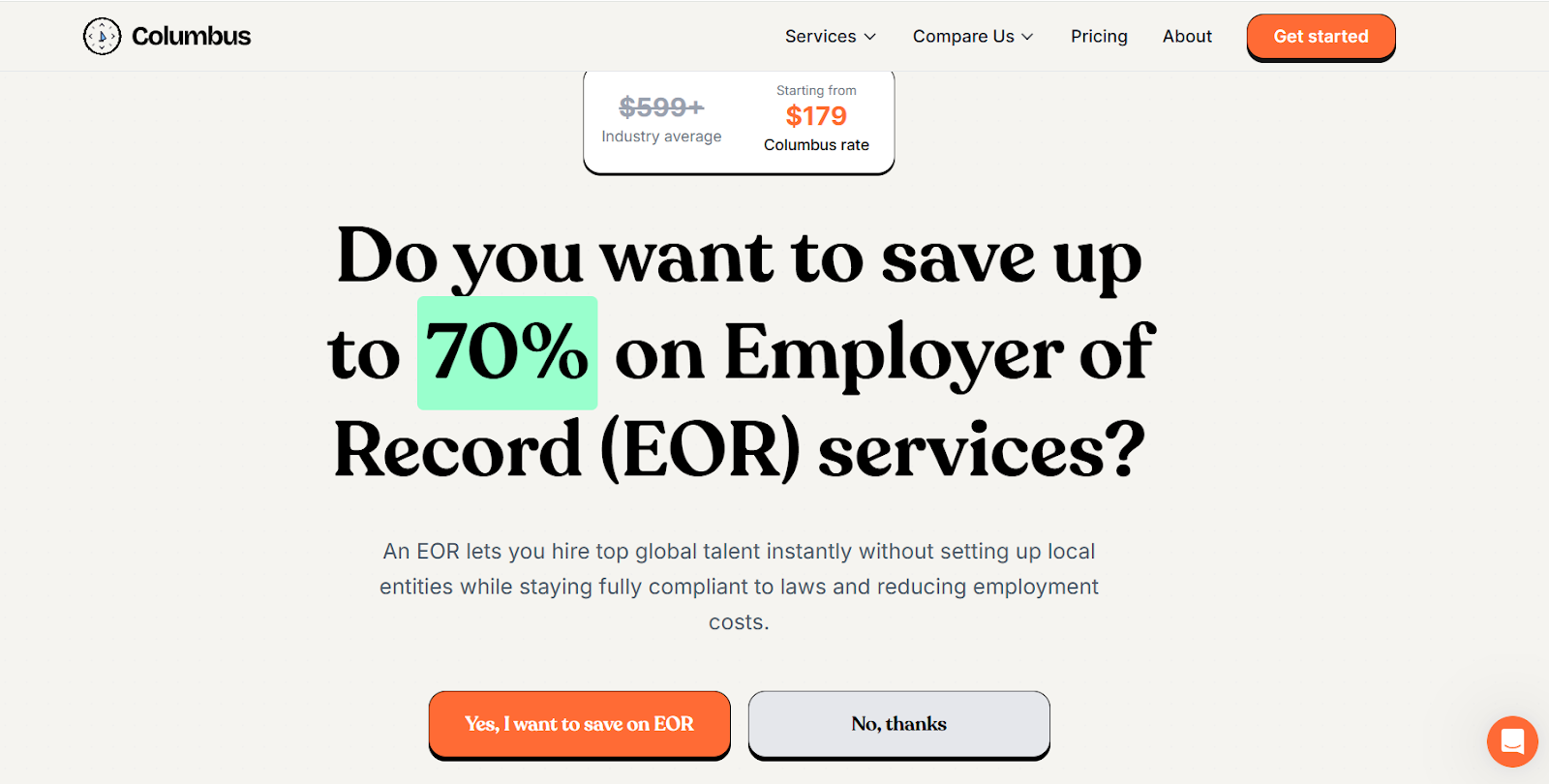 Hire With Columbus positions itself as the most affordable EOR in the market, offering coverage in 246+ countries at $179 per employee per month. According to EOR Overview's 2026 affordability rankings, it's the lowest rate among credible providers.