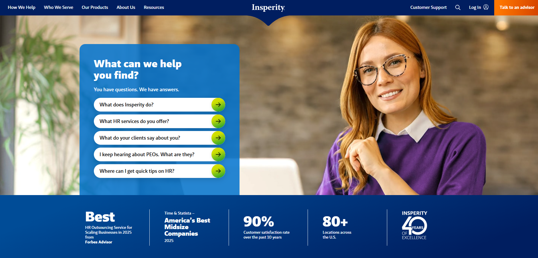 Insperity provides payroll, HR administration, and benefits management, though its international EOR capabilities are limited.