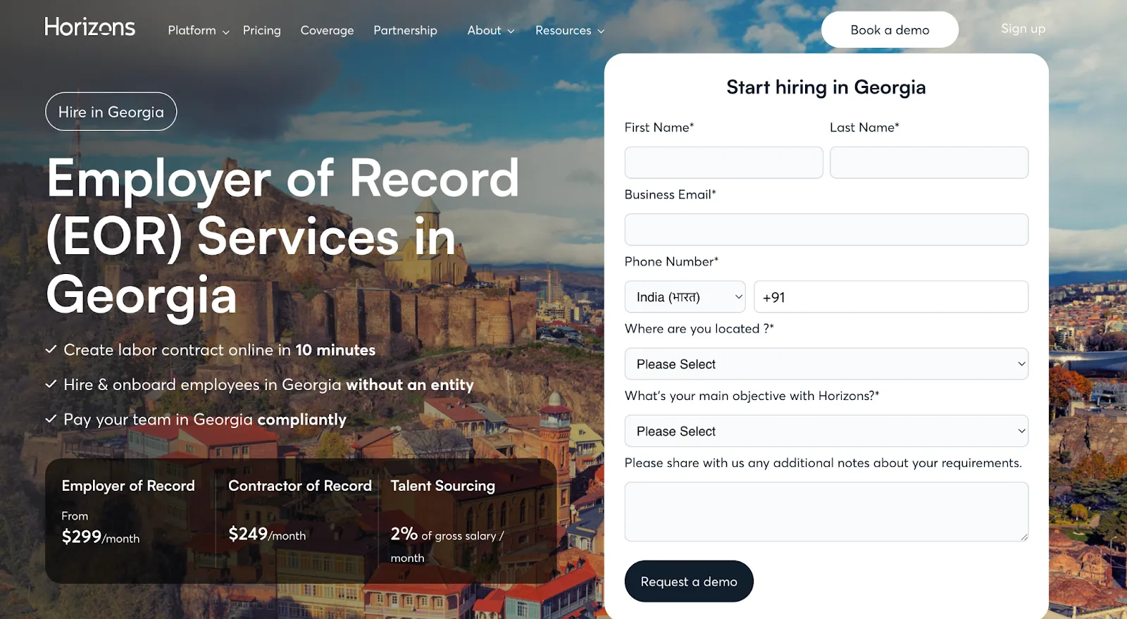 Horizons provides scalable Georgian EOR at $299 per employee/month with 1-2 day onboarding, multilingual support, and 180+ country coverage. They combine rapid deployment with dedicated account management and comprehensive lifecycle support.