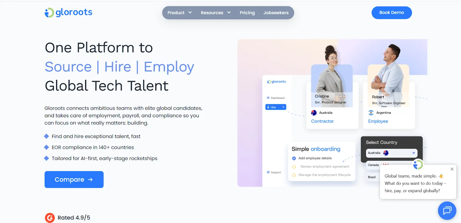 Gloroots differentiates through fixed pricing at approximately $299 per employee monthly, contrasting with variable quotes and opaque billing from most traditional EOR providers.