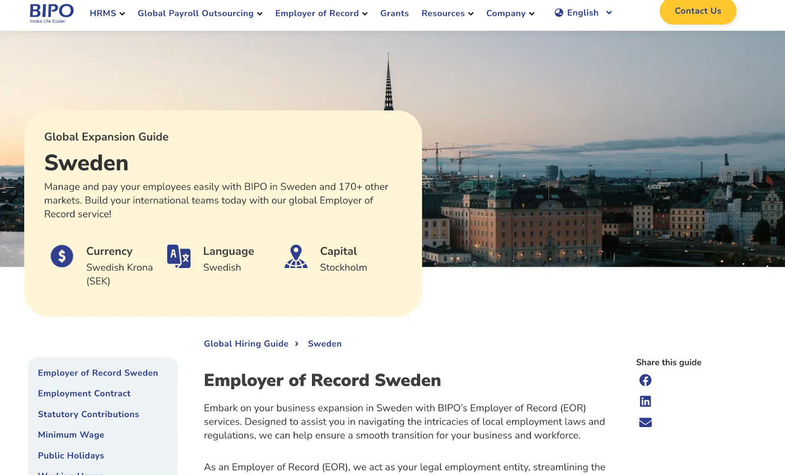 BIPO provides Employer of Record (EOR) services in Sweden as part of its global HR and payroll outsourcing network covering 170+ countries. The platform assists with payroll, compliance, benefits administration, and HR workflows helping companies hire in Sweden without an entity.