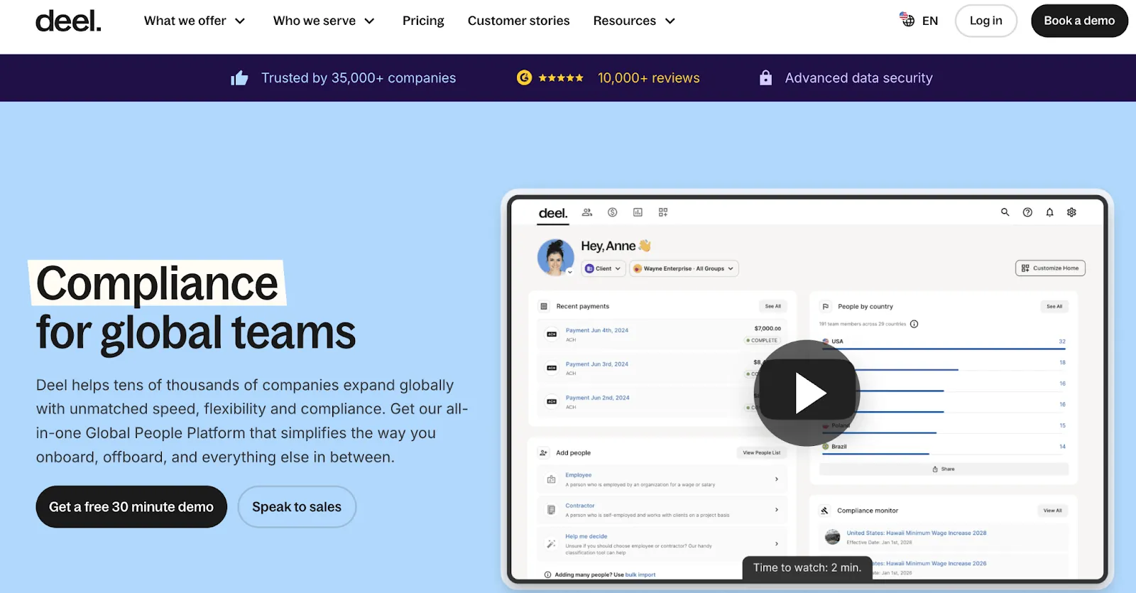 Deel provides a platform for global hiring, payroll, and compliance that supports employees, contractors, and Employer of Record (EOR) arrangements. It is designed for companies that manage a mix of workforce types and need flexibility in how they hire and pay across countries.