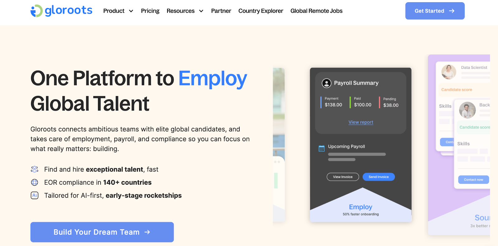 Gloroots speeds up onboarding and manages all local requirements like benefits, contracts, and tax documentation, so you can hire talent anywhere without setting up entities. - Stay compliant in every country.