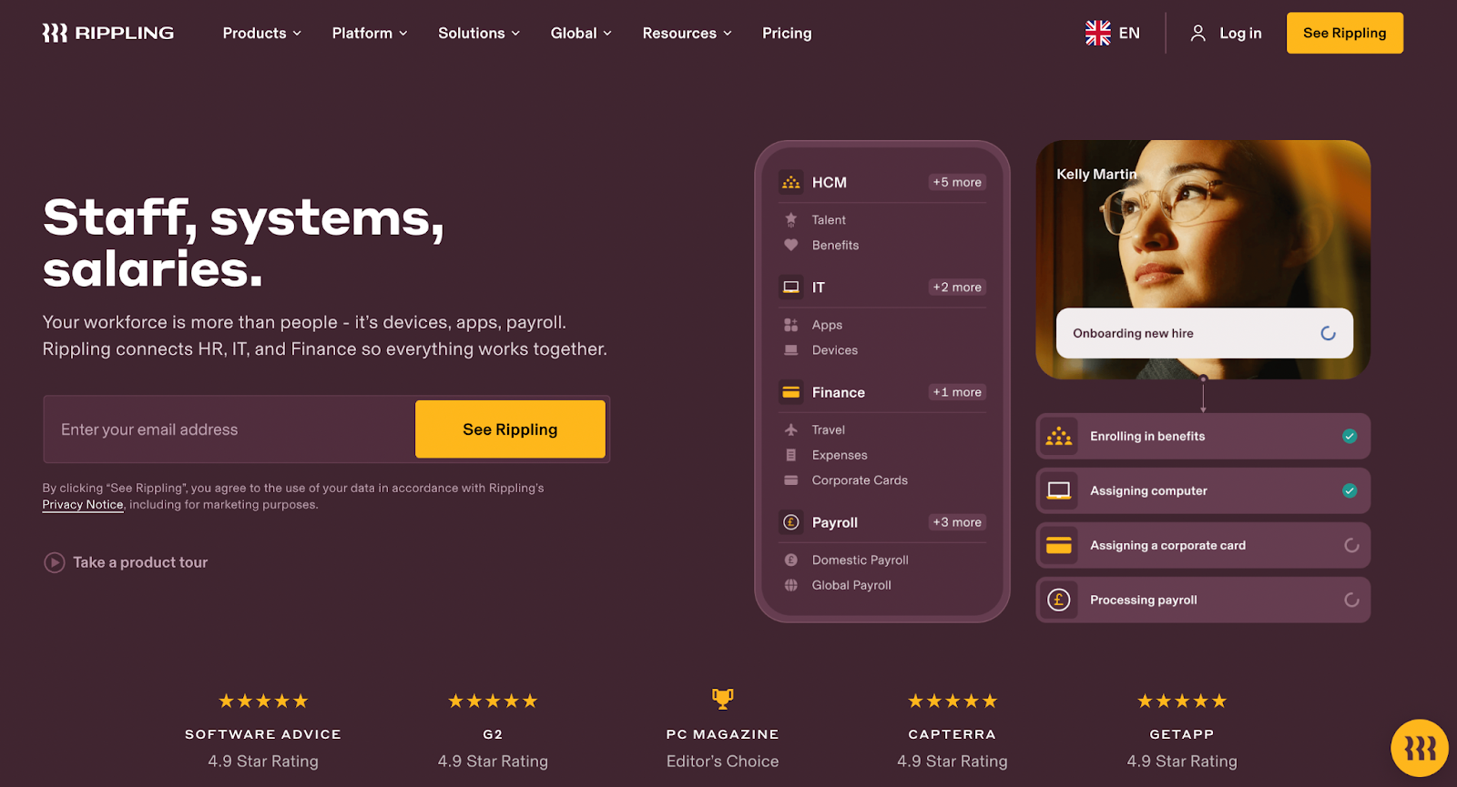 Rippling is a unified workforce platform that combines EOR services with core HR, IT, and finance operations, bringing everything from onboarding to device management under one system.