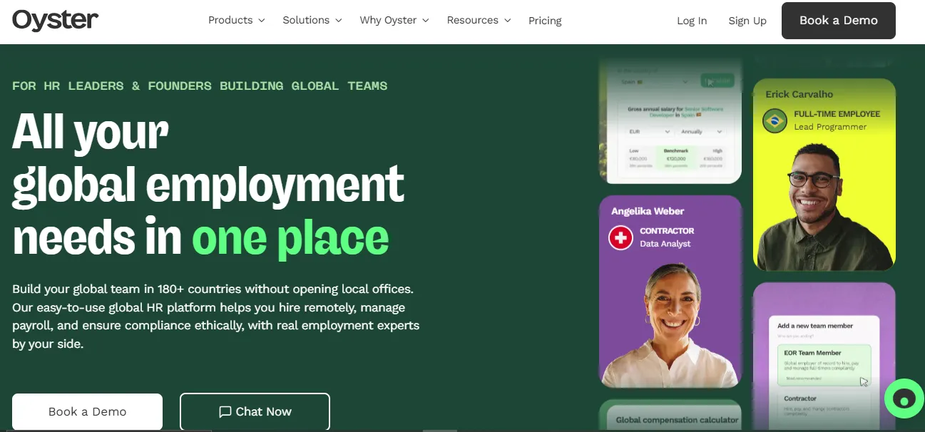 Oyster HR is one of the best PEO companies for international hiring without setting up a local entity. It helps businesses hire, onboard, pay, and manage international employees compliantly.