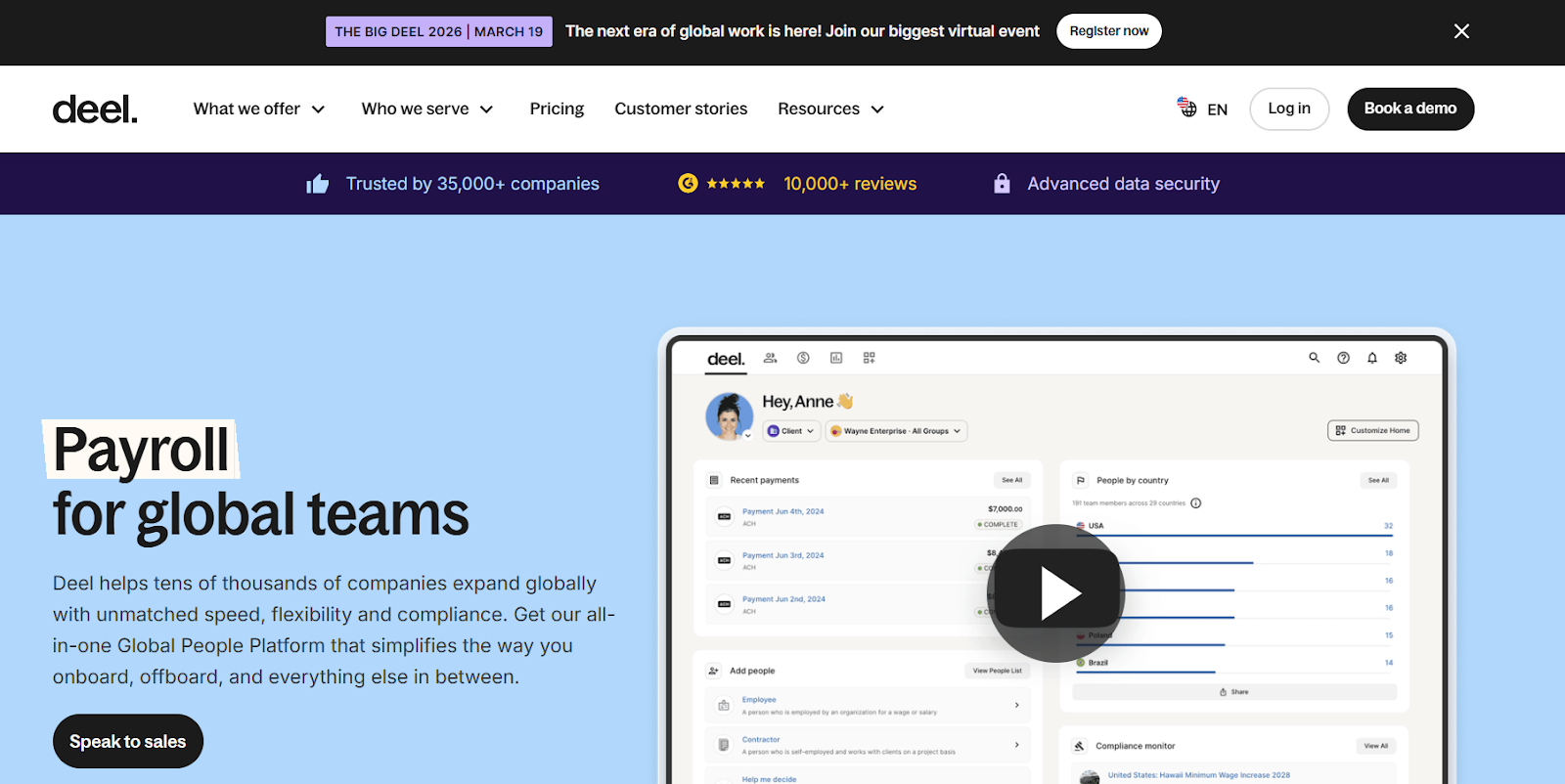 Deel is a global employment platform covering EOR services, contractor payments, and HR management across 150+ countries, positioning itself as the most comprehensive solution for distributed teams.
