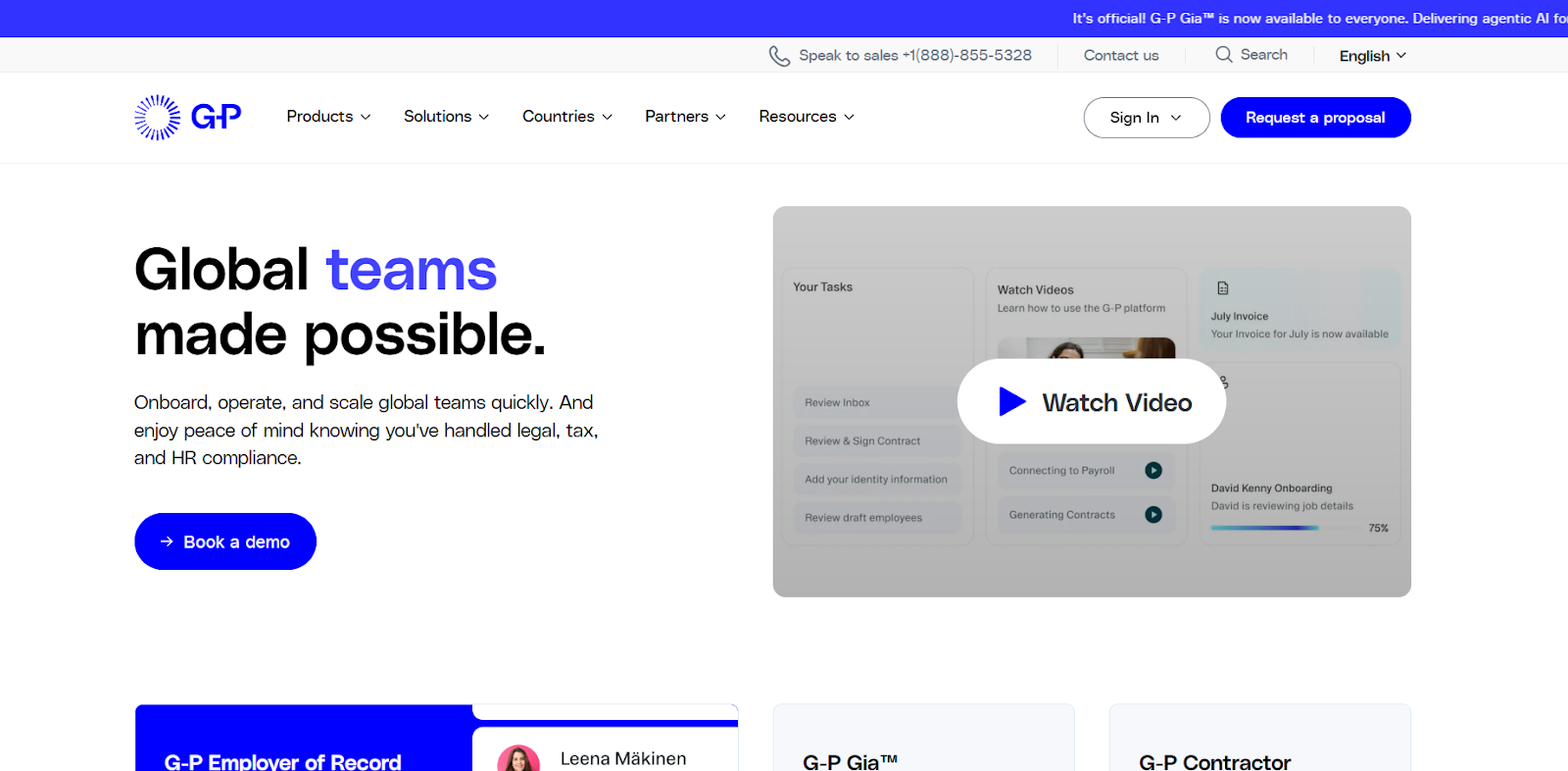 Globalization Partners is an established global EOR provider operating owned legal entities in 180+ countries, offering employment services, compliance management, and risk mitigation for enterprise clients.